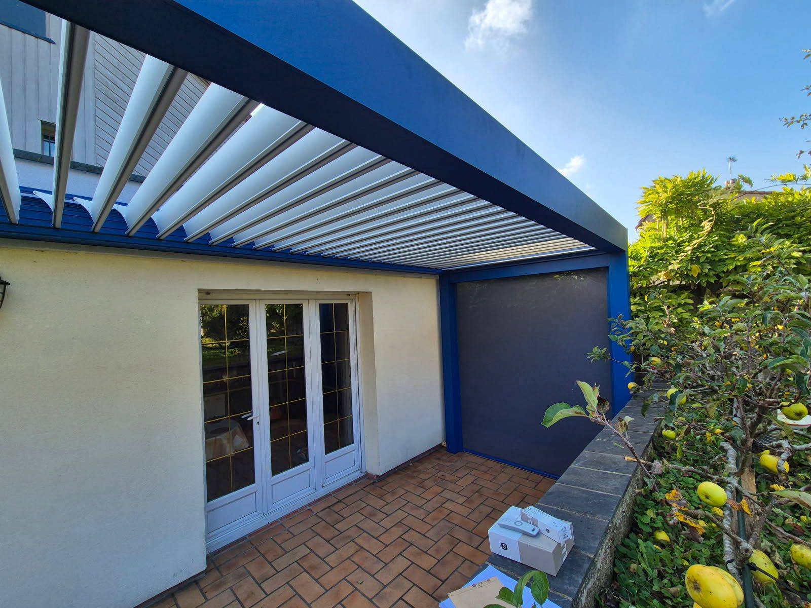 Installation d’une pergola en aluminium accessible, esthétique & fonctionnelle, personnalisée avec coloris bleu gentiane,lames blanches et stores latéraux ZIP à Rouen près de Mont-Saint-Aignan